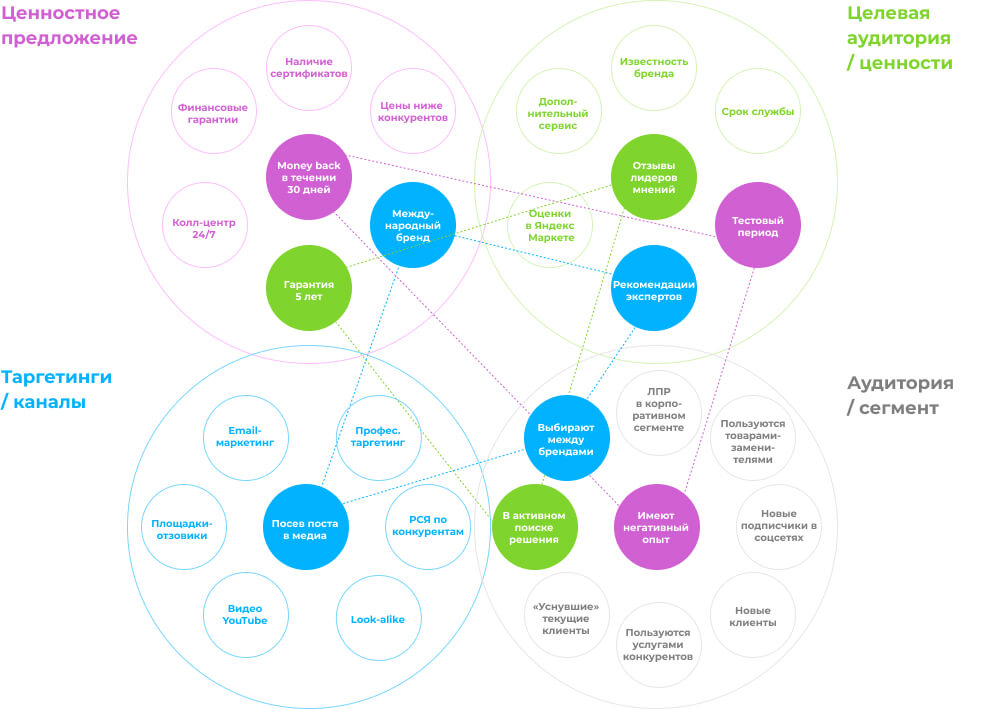 Подбираем каналы, инструменты, формируем ядро запросов и составляем ценностное предложение для каждой группы ЦА на каждом этапе коммуникации.